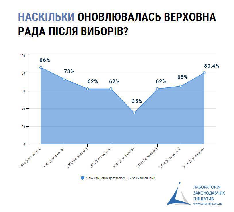 Зокрема, у 2019 році, за даними результатів позачергових виборів, опублікованих виданням «Українська правда», до Верховної Ради потрапляють 80,4% людей, які ще ніколи не отримували мандат. Така міра оновлення не є рекордною для України, однак перевищує показник попереднього скликання.