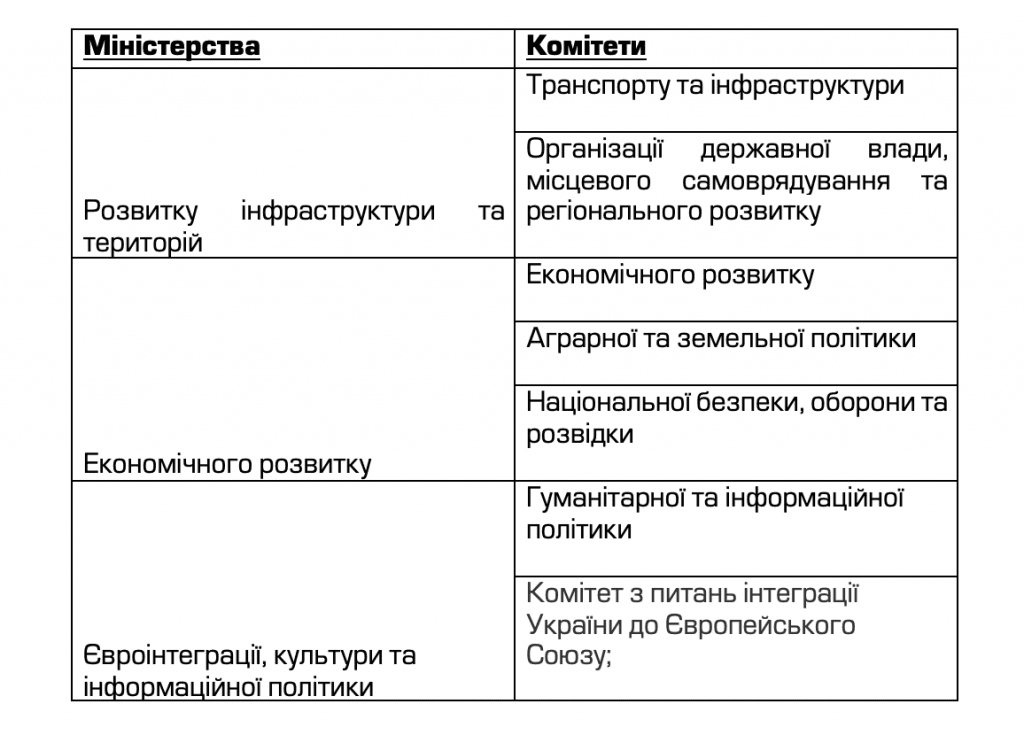 Найоптимальнішим варіантом є переформатування таким чином, аби кожне міністерство отримало по одному відповідному комітету, яке могло би наглядати за діяльністю Уряду в конкретній сфері. Справді системна реформа Кабміну має охоплювати і парламент, а головним принципом має бути збереження балансу між різними гілками влади.