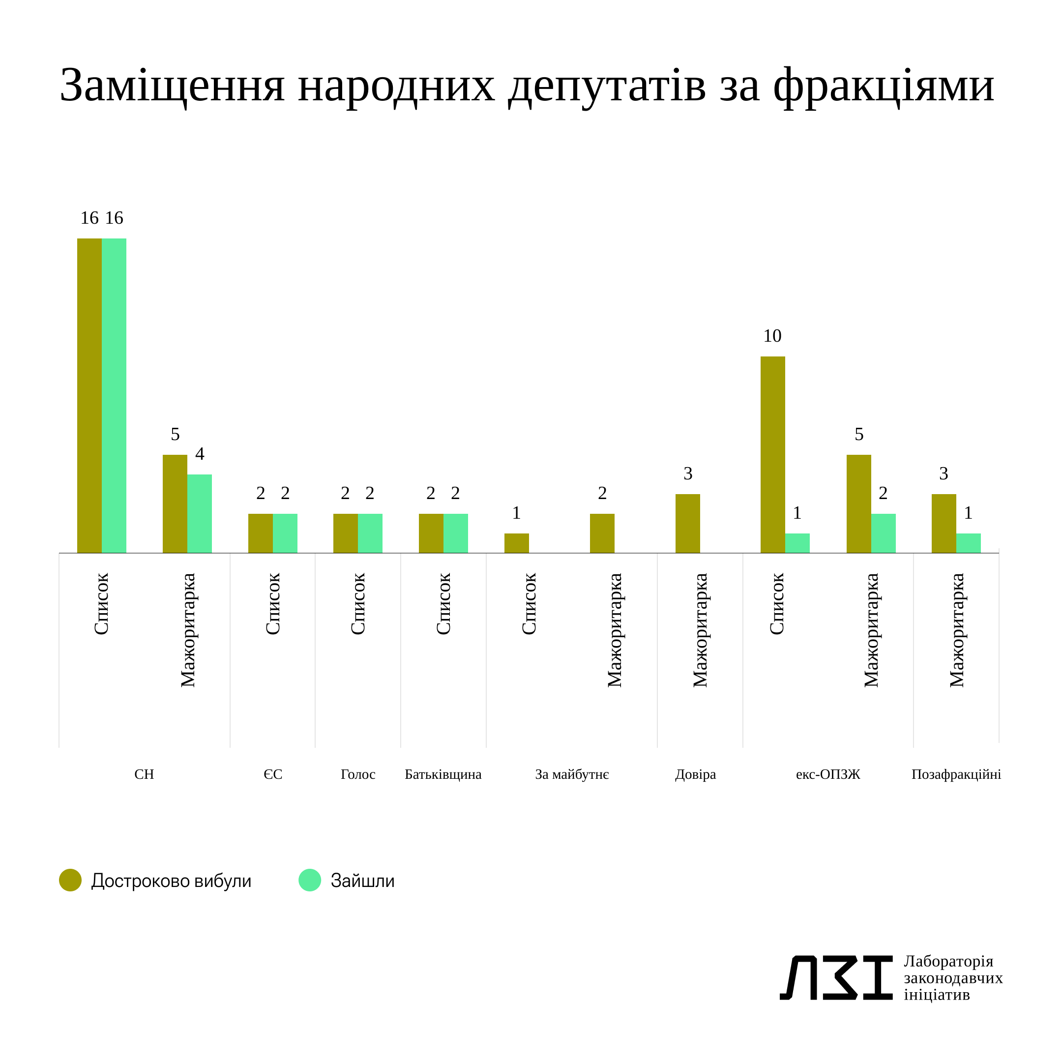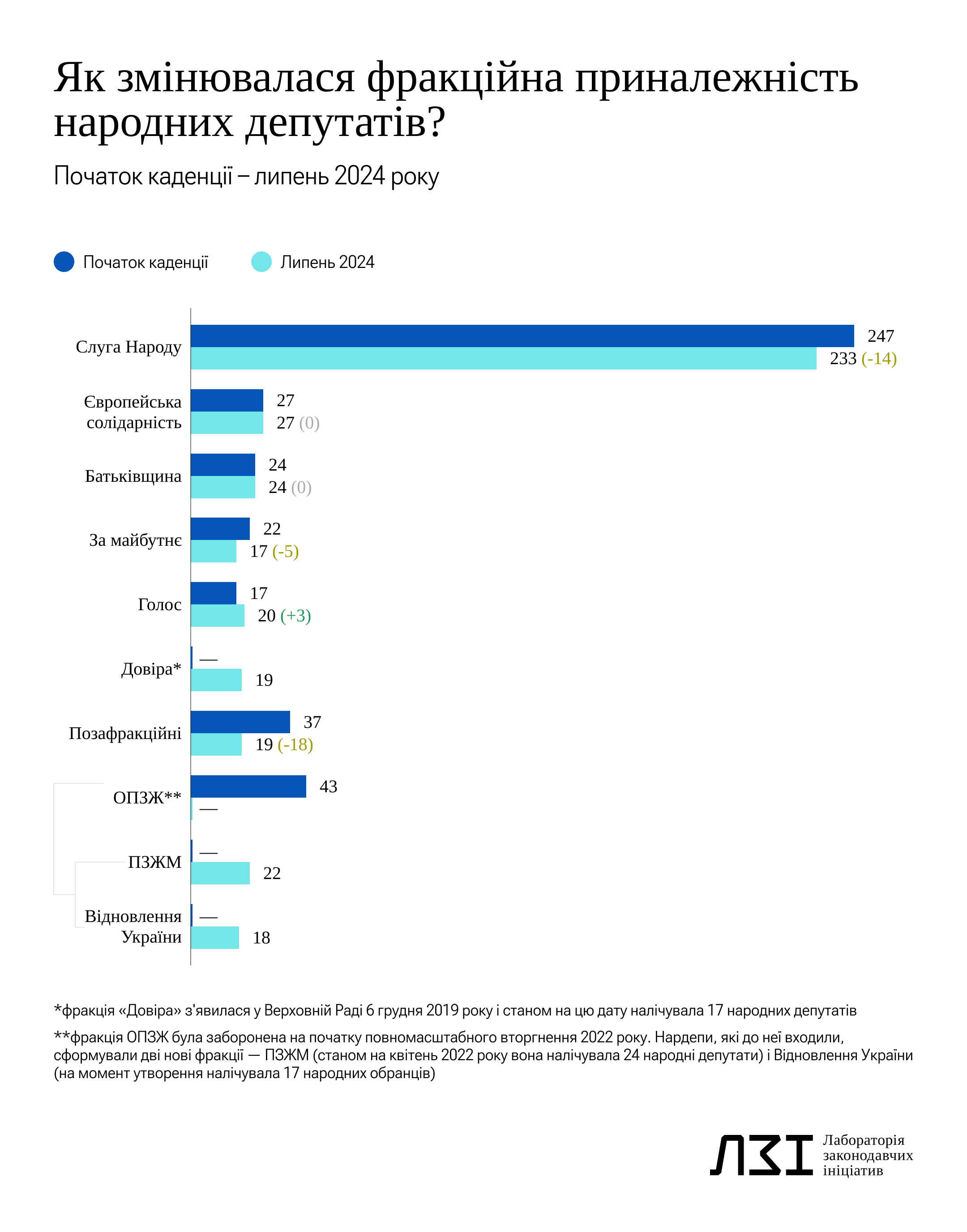 Хоча більшості фракцій навіть в умовах війни вдається оперативно замінювати депутатів-«списочників», вони все одно втрачають своїх нардепів через, наприклад, внутрішні конфлікти або корупційні скандали. Як ми побачимо далі, «Слуга народу» хоч і замінила майже всіх вибулих нардепів, її чисельність за п’ять років знизилася на 14 людей. Також зменшилася чисельність депутатської групи, яка упродовж роботи скликання традиційно підтримувала монобільшість – «За майбутнє», а кількість позафракційних народних депутатів скоротилася майже вдвічі.