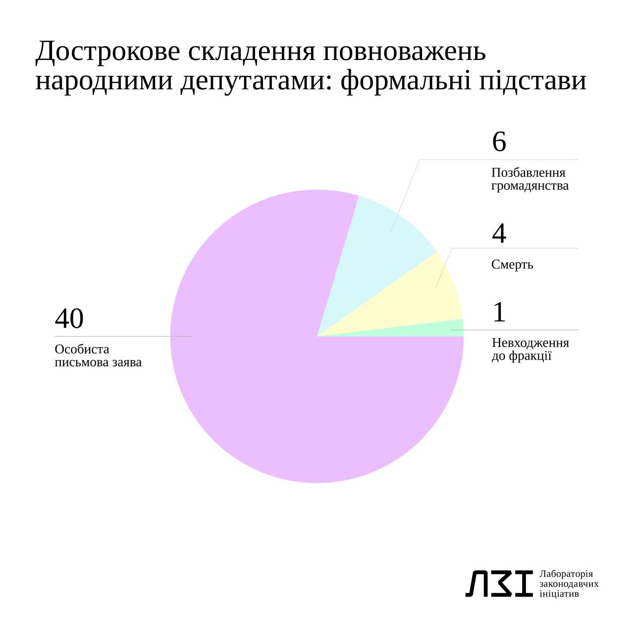 Хоча законодавство пропонує широкий перелік підстав дострокового припинення повноважень нардепів, у 40 з 51 (тобто у 78%) випадків формальною причиною вказане саме подання особистої письмової заяви: так, за «власним бажанням» звільнилися деякі народні депутати забороненої ОПЗЖ, а також скандальний «слуга народу» Олександр Трухін. Водночас найбільш знакові функціонери ОПЗЖ позбулися мандатів саме після того, як Володимир Зеленський позбавив їх громадянства. Це – Віктор Медведчук, Тарас Козак, Ігор Васильковський, Ренат Кузьмін, Андрій Деркач та Вадим Рабінович. Крім того, у 2020 році Святослав Вакарчук подав заяву про дострокове складення повноважень, але вона не набрала необхідну кількість голосів. Через це йому довелося використати норму закону про втрату мандата через вихід з фракції партії «Голос», за списком якої його обрали.