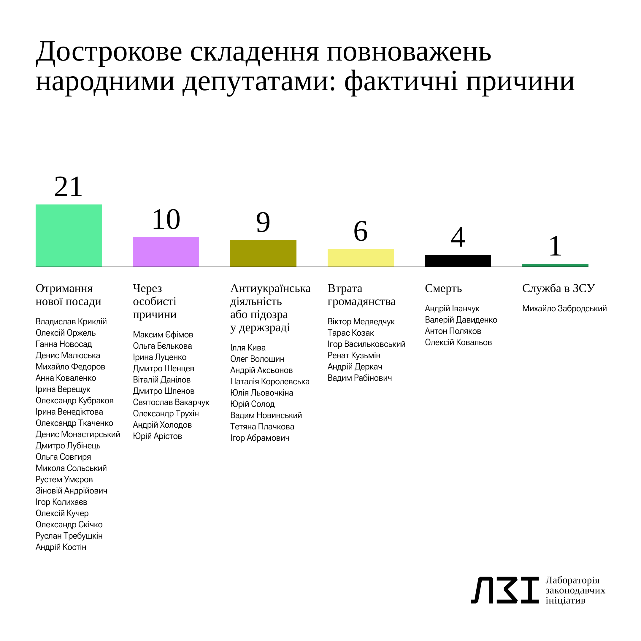 Однак розберімося глибше, що стояло за «поданням особистих письмових заяв про складення повноважень» народними депутатами. Ми виділили шість основних причин (більшість з них збігаються з прописаними у законодавстві) дострокового звільнення народних депутатів.