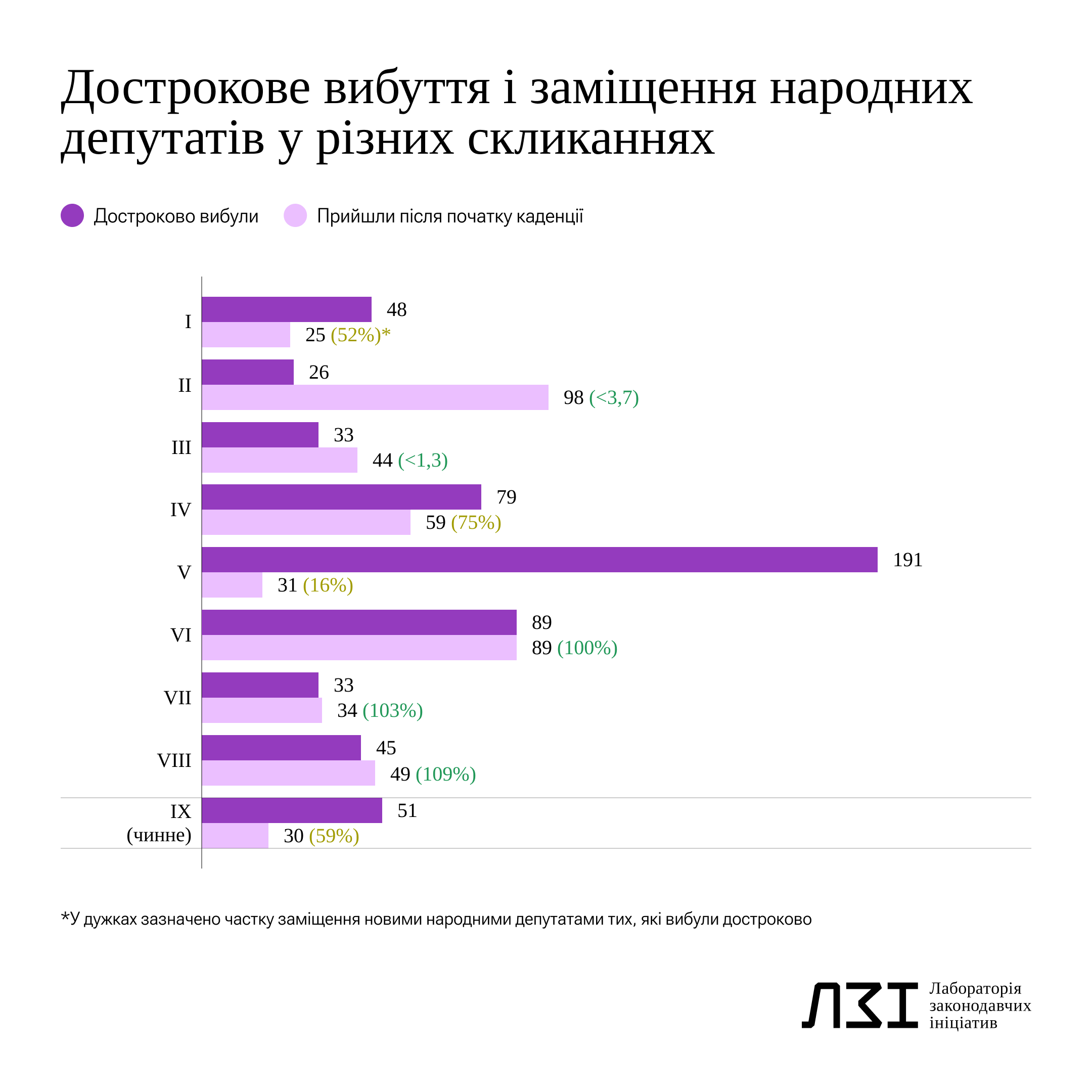Ще гіршою була ситуація у першому скликанні, коли народних депутатів, які вибули, вдалося замінити лише близько на половину. Тут також варто врахувати особливості даних: у деяких скликаннях кількість нардепів, які склали присягу пізніше за інших, більша за кількість тих, які вибули достроково. Тобто новоприбулі обранці не обов’язково заміняли тих, хто вибув, а могли прийти пізніше через, наприклад, проведення довиборів на деяких округах, наявність технічних перепон або судових справ (у дев’ятому скликанні через останню причину пізніше за інших склав присягу Сергій Рудик). Загалом же, повністю замістити вибулих народних депутатів вдалося лише у шостому скликанні (при 100% пропорційній виборчій системі).