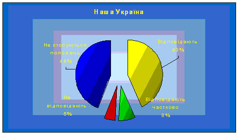 Характерною особливістю програми Блоку є те, що вона, фактично, не містить положень, які б можна було однозначно оцінити на предмет їхнього дотримання чи, навпаки, порушення. Вона рясніє оціночними поняттями на зразок “ефективний”, “дієвий”, “послідовний”, “передбачуваний”, “справедливий” тощо, а також неконкретними гаслами, як-то: “підвищимо”, “активізуємо”, “розширимо” та ін. Програма “Нашої України” є, скоріше, програмою цілей – вона, фактично, не визначає заходи та кроки, необхідні для їх досягнення.