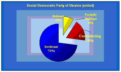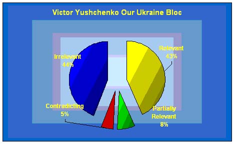 Characteristically, though, the program features almost no provisions that could be measured exactly in terms of their fulfillment or failure. The text abounds with evaluative notions like “efficacious”, “efficient”, “coherent”, “fair” etc, as well as vague and slogan type of verbs like “increase”, “activate”, “enhance” and others. This makes the Our Ukraine program look like that of objectives, as it defines practically no measures or moves required for their achievement.
