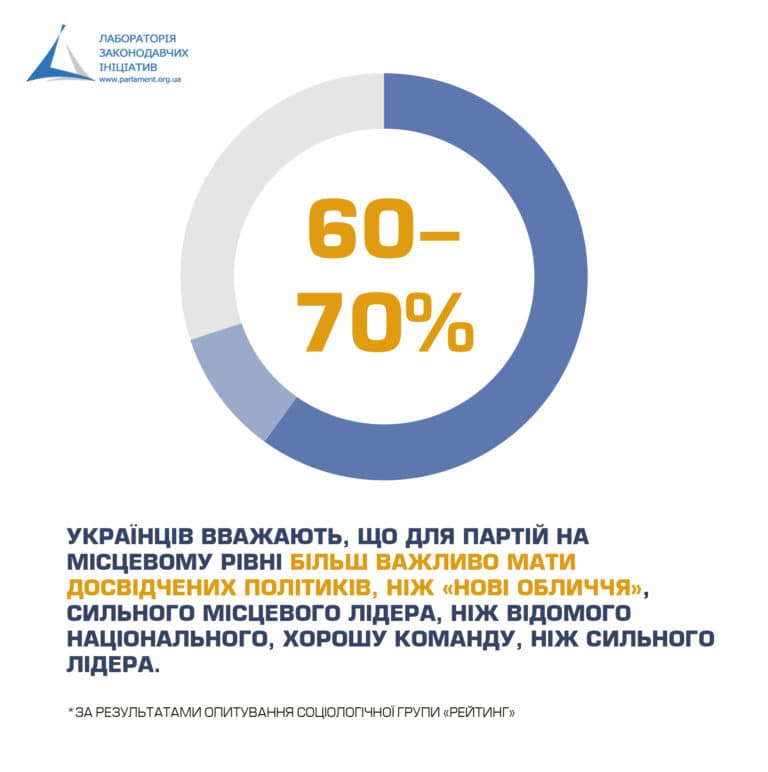 Результати опитування Соціологічної групи Рейтинг показали: більшість респондентів (60-70%) вважають, що для партій на місцевому рівні більш важливо мати сильного місцевого лідера, ніж відомого національного, досвідчених політиків, ніж «нові обличчя», хорошу команду, ніж сильного лідера. Політичні гравці, так чи інакше, змінюються, а органи влади – «оновлюються». Зокрема, ми в Лабораторії законодавчих ініціатив після минулих парламентських виборів підрахували, що до Верховної Ради потрапили 80,4% «нових облич». Це – люди, які до того жодного разу не отримували мандат народного депутата.
