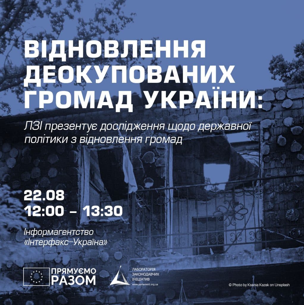 22 серпня 2023 року Лабораторія законодавчих ініціатив (ЛЗІ) презентуватиме результати дослідження «Відновлення деокупованих громад України: аналіз досвіду та потреб». Дослідження було підготовлене в рамках реалізації проєкту «Громадянське суспільство для післявоєнного відновлення України та готовності до ЄС», який фінансується Європейським Союзом.