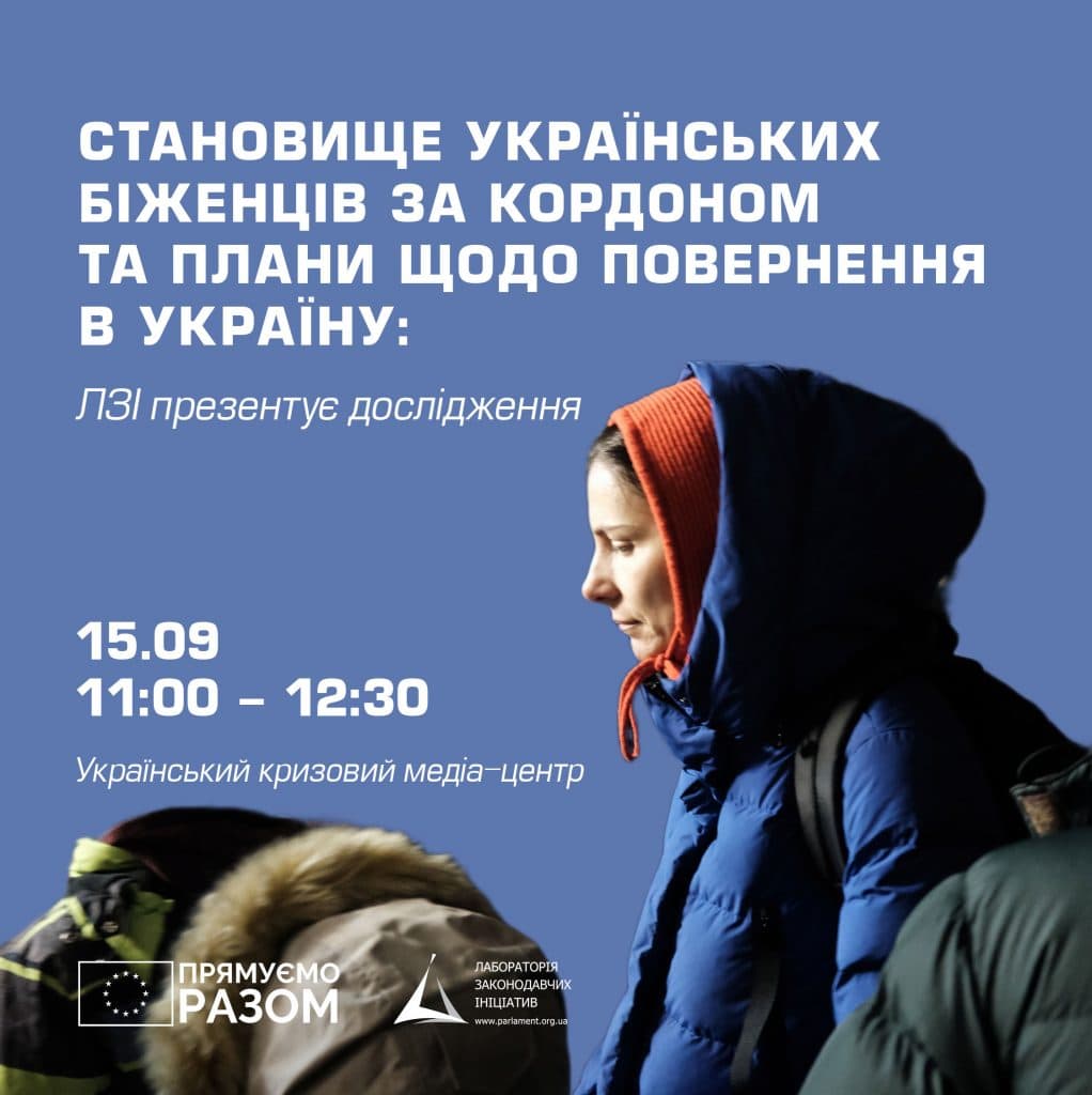 15 вересня 2023 року Лабораторія законодавчих ініціатив презентуватиме результати дослідження «Становище українських біженців за кордоном та їхні плани щодо повернення в Україну». Дослідження було підготовлене в рамках реалізації проєкту «Громадянське суспільство для післявоєнного відновлення України та готовності до ЄС», який фінансується Європейським Союзом.