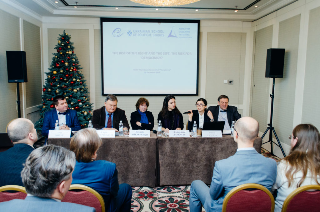 І панель Конференції “Піднесення “лівих” та правих” сил: згортання демократії?” присвячена загальносвітовим тенденціям в країнах сталої демократії, запропонувавши гостям та учасникам задуматися над кризою ідеологій та партій, причинами піднесення “правих”, та оцінкою “життєздатності” правих ідеологій серед українського електорату. Відкрив конференцію почесний директор Української Школи Політичних Студій Ігор Когут, закликавши учасників задуматися над викликами, які постали перед Україною, ЄС, країнами Східного партнерства, після виборів у Молдові, Болгарії, та тими ризиками, які несуть майбутні вибори у Франції.
