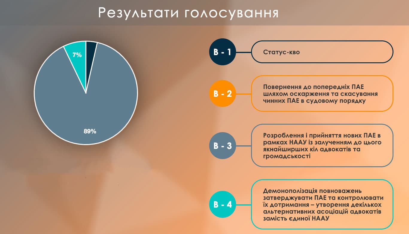 Результати голосування розподілились наступним чином: перший сценарій набрав 4 % голосів, другий – 0 %, третій – 86 %, четвертий – 7%. Таким чином, учасники обговорення з великою перевагою обрали варіант розроблення і прийняття нових ПАЕ в рамках НААУ із залученням до цього якнайширших кіл адвокатів та громадськості. При цьому під час обговорення неодноразово звучала теза про відсутність майданчиків для обговорення таких важливих проблем. Взагалі було виявлено системний дефіцит комунікації в спільноті НААУ.