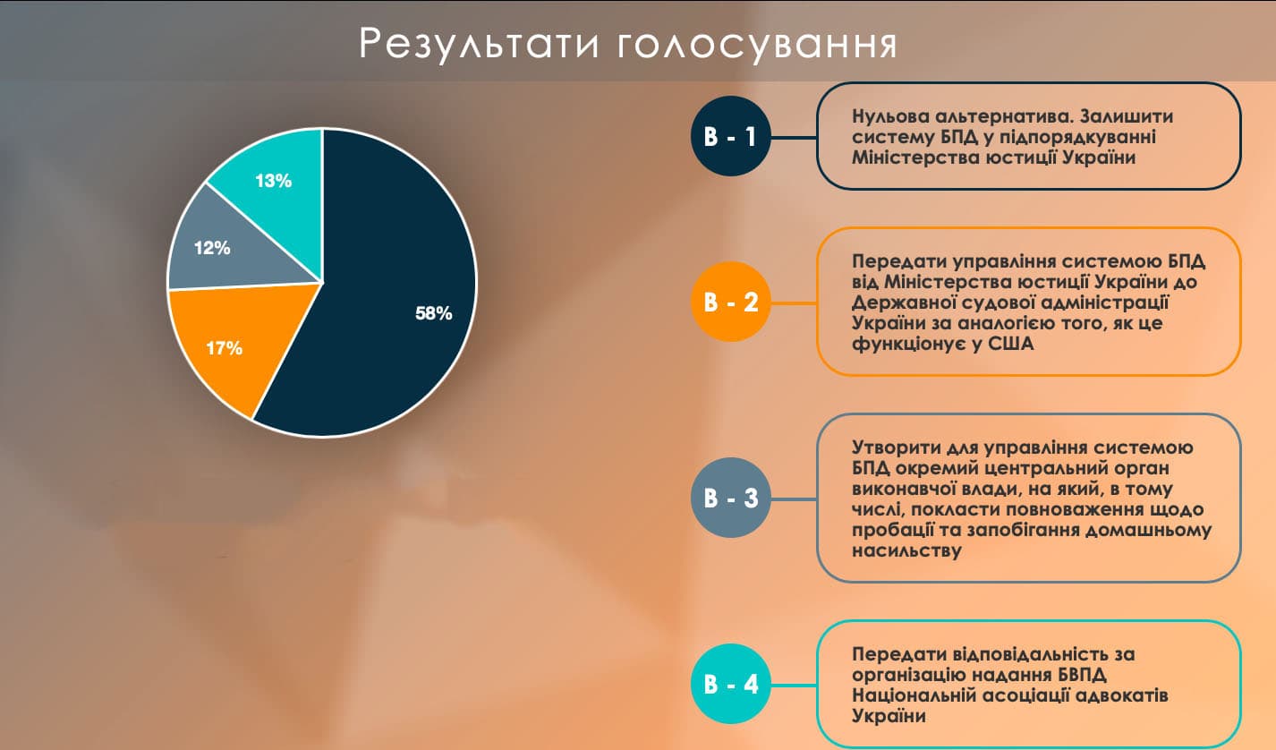 Щодо системи фінансово-організаційної основи надання послуг, то з великим відривом перемогла нульова альтернатива, тобто виконання закону «Про безоплатну правову допомогу» без змін. За цей варіант свої голоси віддало 67% учасників заходу. Другим за кількістю відданих голосів опинився варіант щодо диверсифікації джерел фінансування безоплатної вторинної правової допомоги між державним бюджетом, місцевими бюджетами, а також отримувачами безоплатної правової допомоги (21% голосів).