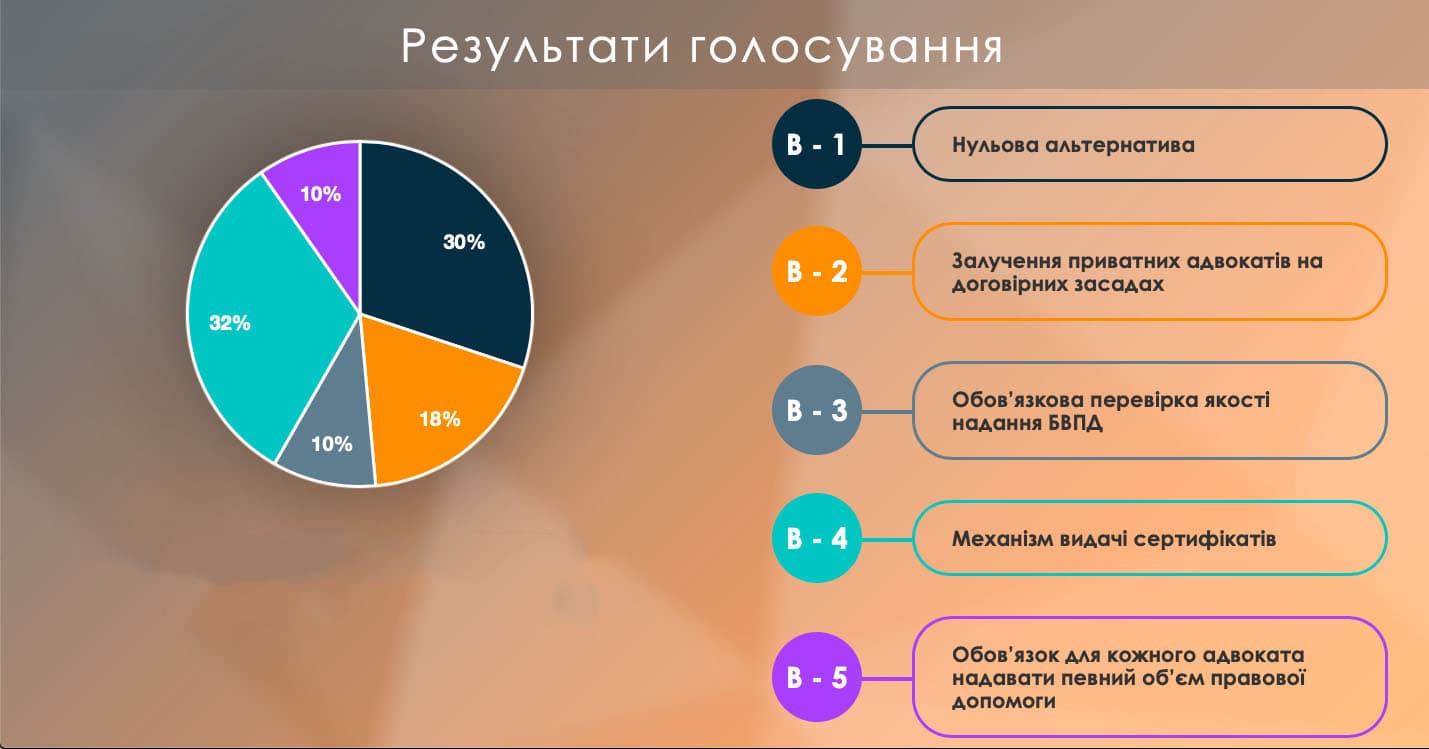 Найменше голосів (12%) зібрав варіант, згідно якого гарантується державне фінансування насамперед або виключно безоплатної вторинної правової допомоги у кримінальних провадженнях.