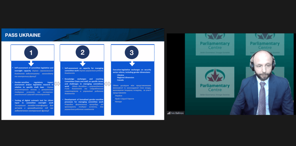 Наприкінці заходу Директор аналітичного відділу Лабораторії Олександр Заславський та Директор Програми розвитку та партнерства Парламентського центру Канади Іво Балінов детальніше розповіли про суть, етапи і компоненти проєкту «Парламентська підзвітність сектору безпеки в Україні».