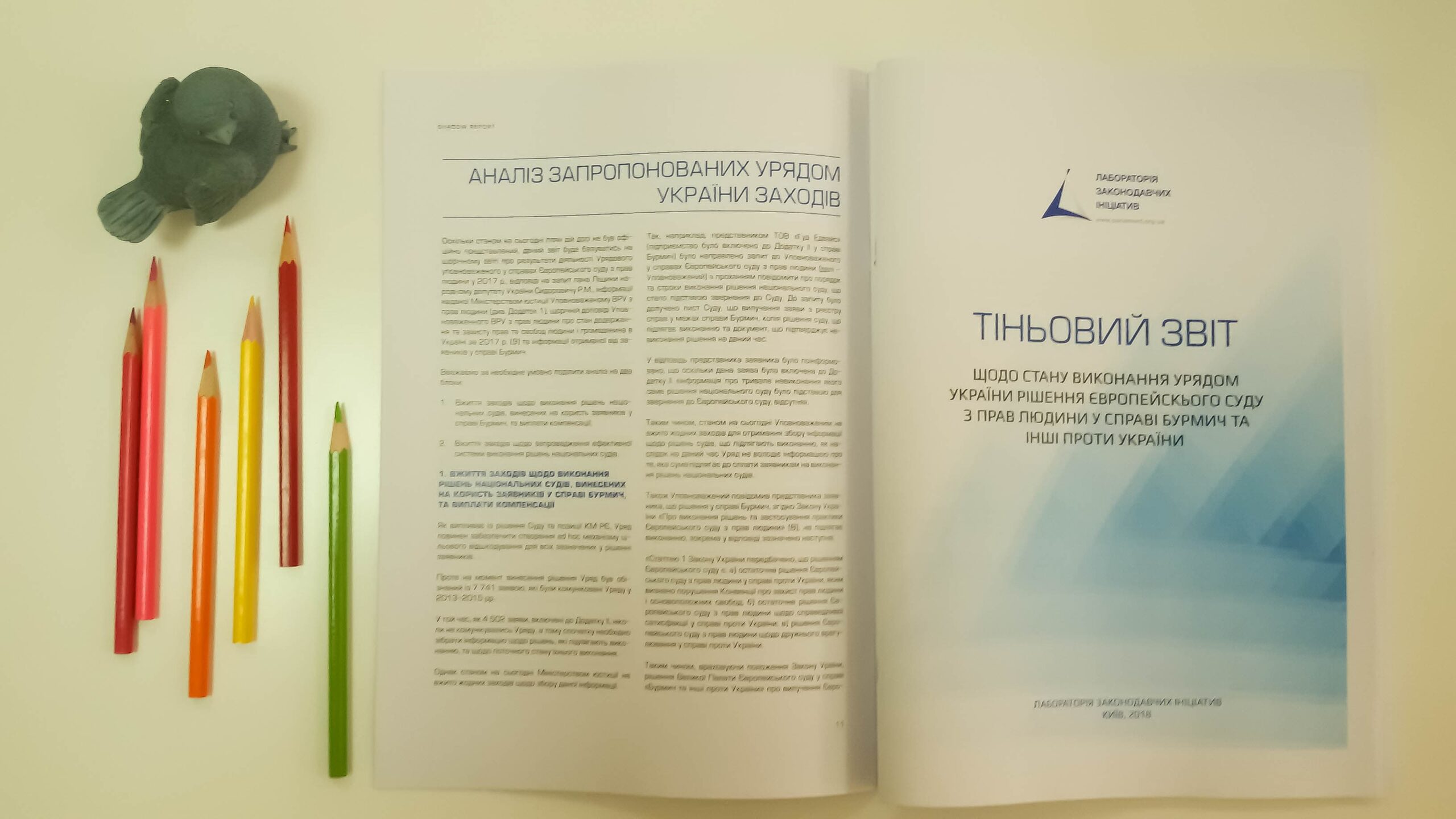 Світлана Матвієнко, Голова Ради Лабораторії законодавчих ініціатив, презентуючи Тіньовий звіт, підготовлений експертом Лабораторії законодавчих ініціатив, зазначила, що джерелом інформації для Звіту стали щорічний звіт про результати діяльності Урядового уповноваженого у справах Європейського суду з прав людини у 2017 р., відповіді на запит пана Ліщини народному депутату України Сидоровичу Р. М., інформація, надана Міністерством юстиції̈ Уповноваженому ВРУ з прав людини, щорічна доповіді Уповноваженного ВРУ з прав людини про стан додержання та захисту прав та свобод людини і громадянина в Україні за 2017 р. та інформація, отримана від заявників у справі Бурмич.