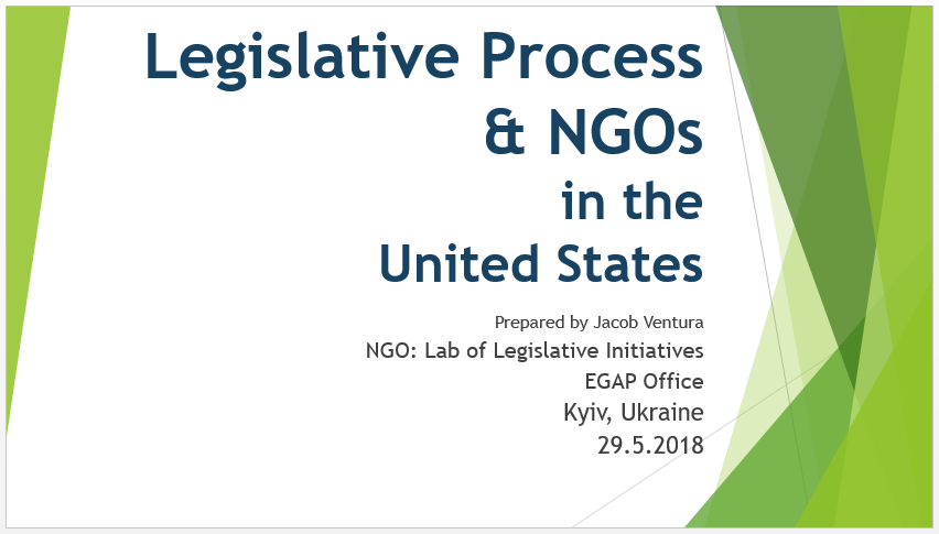 29 травня 2018 року в Києві пройшов семінар «Законодавчий процес в США: процедура, етапи та роль громадськості» за участі Джейкоба Вентури, американського адвоката, радника з юридичних питань представника Стівена Ховіта у Законодавчому офісі США (Штат Массачусетс).