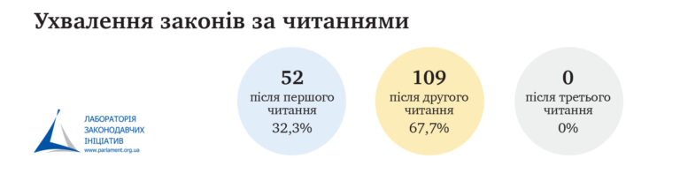 Також до позитиву можна віднести збільшення частки законопроєктів, які приймалися в другому читанні. Це покращує якість законопроєктів, адже дає більше часу на підготовку, виправлення помилок та усунення недоліків, наявних при першому читанні. Втім, третє читання залишається «мертвою» нормою. Жоден законопроєкт цієї сесії не дійшов до цього етапу. Взагалі, востаннє про цю норму згадували ще в 2015 році.