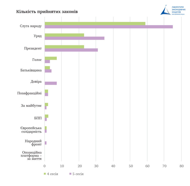 Якщо «рекордсменом» цієї сесії можна назвати Слугу Народу, то найменш плідно попрацювала друга за величиною фракція – ОПЗЖ. За 5 сесію, як і за всю 4 сесію, Рада не прийняла жодного законопроєкту, ініціатором якого був депутат від ОПЗЖ. Водночас за 5-ту сесію прийняли два закони, які зареєстрували ще минулого скликання: один ініційований БПП і один Народним Фронтом. Серед міноритарних фракцій та груп виділилася лише група «Довіра», що була ініціатором 7 ухвалених законів.