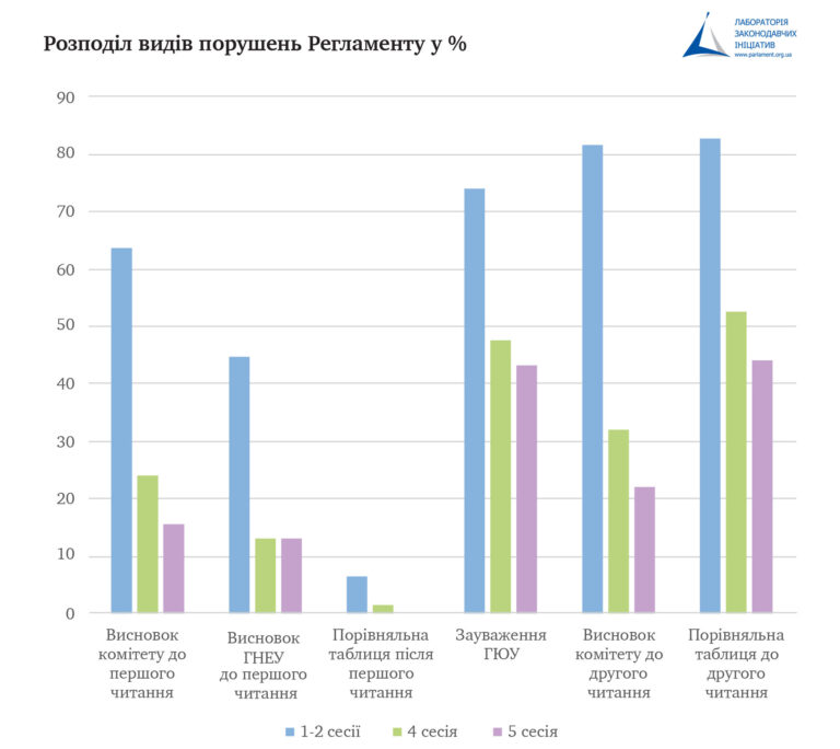 Цієї сесії ми також зафіксували зменшення кількості законопроєктів, які приймали з порушенням Регламенту. Хоча порушення все-таки є. У частині ухвалених законів відсутні або подані з порушенням терміну висновки головного комітету та Головного науково-експертного управління (ГНЕУ) до першого читання. Схожа ситуація і з висновками головних комітетів, ГНЕУ та Головного юридичного управління (ГЮУ) до другого читання. Це звісно не позитивна ситуація, але, порівнюючи з попередніми сесіями, кількість таких порушень зменшилась.