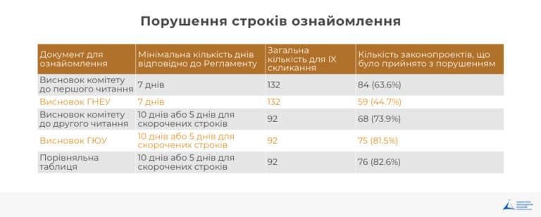 Загалом, зі 132 прийнятих законів 125 були прийняті хоча б з одним порушенням строків ознайомлення.