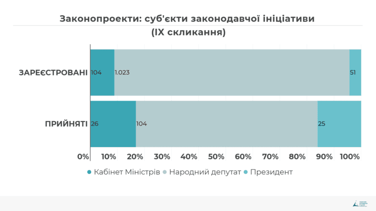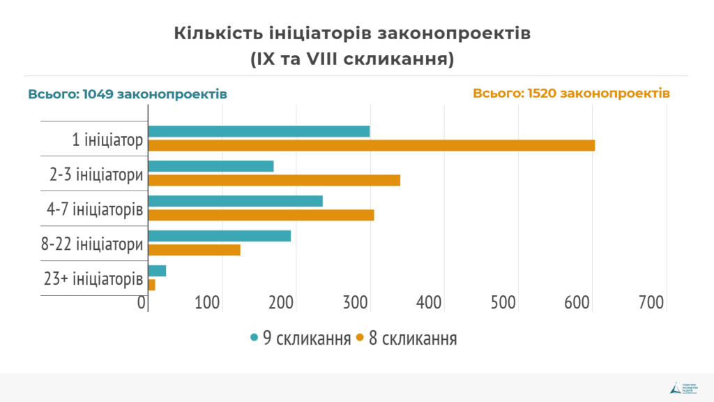 З законопроектів, що були зареєстровані депутатами IX скликання 33% законопроектів мають одного ініціатора, що на 11% менше ніж у попередньому скликанні. Зменшення кількості законопроектів з одним ініціатором – ознака руху українського парламенту в бік більшої структуризації парламенту і обмеження тенденції ультраактивного використання народними обранцями права законодавчої ініціативи одноособово.