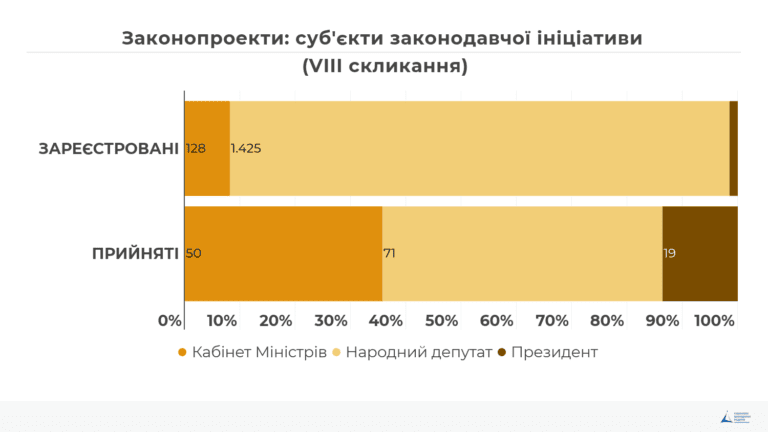 Розподіл зареєстрованих законопроектів у VIII скликанні в цілому відповідає такому розподілу у IX скликанні. Та у VIII скликанні значно більший відсоток прийнятих законів, суб’єктом законодавчої ініціативи яких був Уряд (35% проти 17% в IX скликанні). Така тенденція може свідчити про послаблення ролі нового уряду у формуванні державних політик. З іншого боку, така ситуація може мати місце, коли політичні актори (у цьому випадку – урядова монобільшість) намагаються подавати урядові законопроекти через народних депутатів для того, щоб уникнути довгих процедур узгодження в уряді. Втім практика реєстрації урядових законопроектів через депутатів простежувалася і у VIII скликанні. Це може негативно впливати на якість законопроекту та на процес його реалізації.