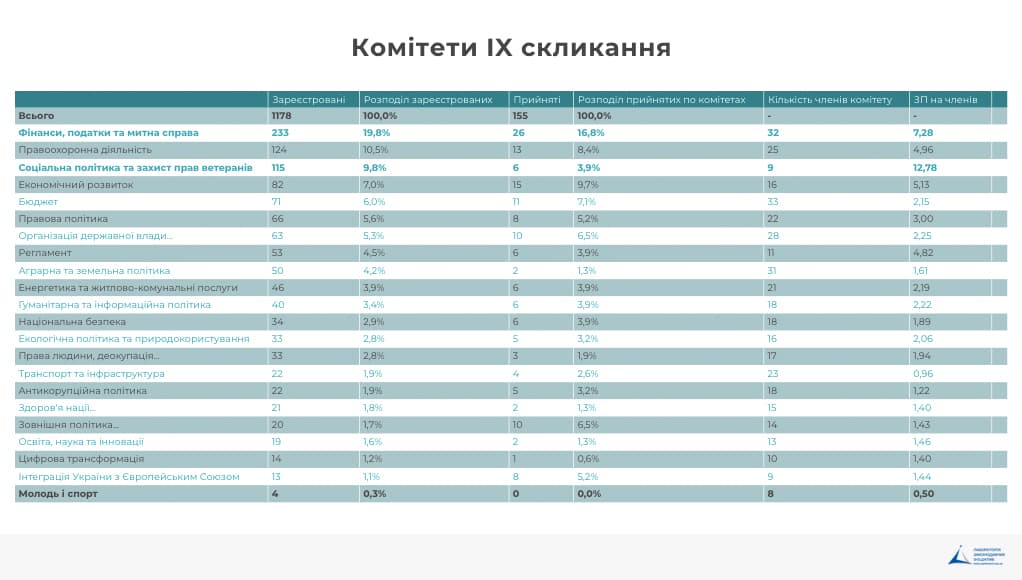 Комітет з питань соціальної політики. Найбільш завантаженим став Комітет з питань соціальної політики та захисту прав ветеранів Секретаріат комітету складається з 11 осіб. , де на одного депутата прийшлося близько 12 законопроектів. 9,5 законопроектів на депутата, якщо не враховувати повернуті суб’єктам законодавчої ініціативи. Цікавим є те, що найбільша кількість повернутих законопроектів саме в цьому комітеті – 29 законопроектів. Тому залишається незрозумілою невелика чисельність комітету – 9 осіб. У VIII скликанні комітет складався з 7 осіб. Крім цього, дивує розподіл законопроектів по суб’єктах законодавчої ініціативи, лише 7 з 113 законопроектів було зареєстровано Урядом. Прослідковується нерозуміння депутатами важливості соціальної політики та основних принципів її функціонування. Але така ситуація аналогічна і для інших комітетів.