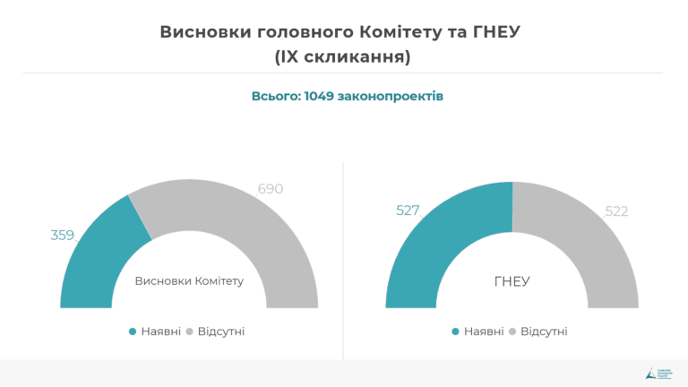 Висновки ГНЕУ. Висновки ГНЕУ з’являються раніше за висновки комітетів в більшій частині випадків. Ці дані, зокрема, ілюструють високий запит комітетів на висновки ГНЕУ та його авторитетність для комітетів. Хоча Регламент і не містить норми, яка б зобов’язувала комітети орієнтуватися на висновки ГНЕУ. Регламент прямо не визначає висновки ГНЕУ та ГЮУ як обов’язкові. Така ситуація потребує перегляду ролі експертних підрозділів у Верховній Раді та оновлення положень Регламенту в цій частині.