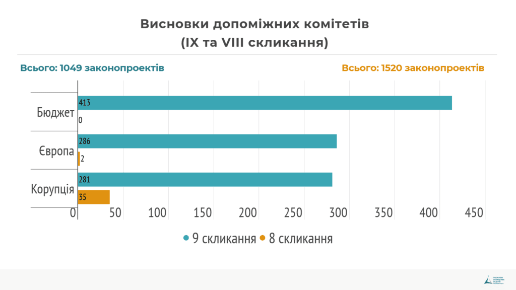У VIII скликанні ця практика не була поширена або ж була неформалізована, як, наприклад, у випадку з бюджетним комітетом, коли рішення комітету приймалися щодо законопроектів, але в публічному доступі були відсутні. У IX скликанні відбулось невелике зрушення щодо надання висновків допоміжних комітетів. Так, 39% законопроектів мають висновок комітету з питань бюджету, 27% законопроектів висновки комітету з питань європейської інтеграції та 27% – висновки комітету з питань запобігання корупції. Враховані лише законопроекти, які зареєстровані суб’єктами законодавчої ініціативи поточного скликання.