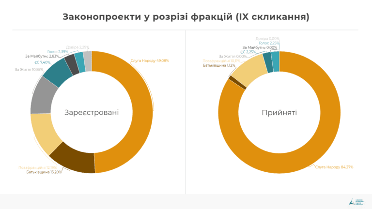 З 919 депутатських законопроектів половина була зареєстрована представниками Фракції Політичної партії Слуга народу. Монобільшість має і найбільшу кількість прийнятих законопроектів з числа депутатських (75 законів або 84%). В опозиційних партій дуже мала частка прийнятих законів.