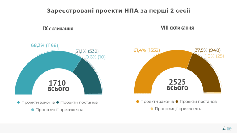 За 1-2 сесії IX скликання було зареєстровано1710 проектів нормативно-правових актів, з яких 532 проекти постанов, 1168 проектів законів та 10 пропозицій Президента до Закону. Оскільки пропозиції Президента реєструються як проекти законів, то загальна кількість зареєстрованих проектів законів – 1178.