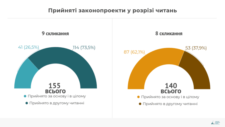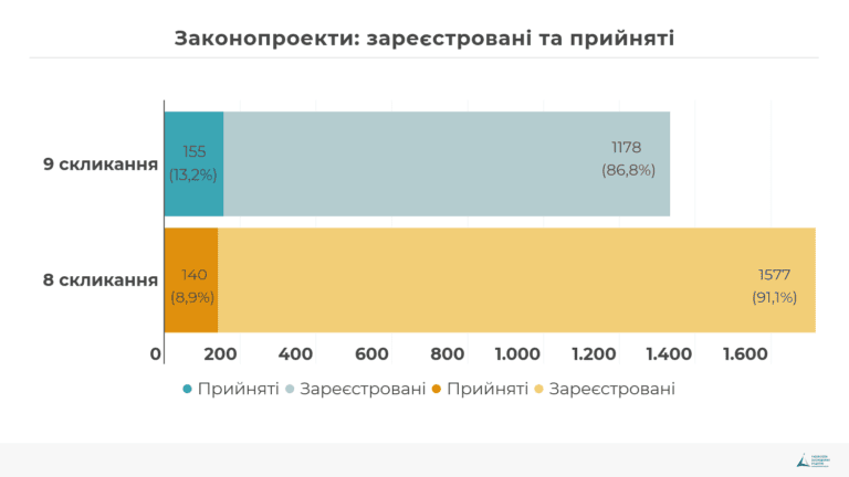 За період 1-2 сесій парламенту IX скликання було прийнято 155 законів З них 23 перенесені законопроекти. Тобто 9% законопроектів, що були зареєстровані суб’єктами законодавчої ініціативи IX скликання, було прийнято. , що складає близько 13% від зареєстрованих. У VIII скликанні було прийнято 140 законів або 9% від зареєстрованих. На графіку видно, що, порівняно з VIII скликанням, кількість прийнятих законопроектів суттєво не збільшилась, незважаючи на голосні заяви щодо турборежиму. Як буде видно з наступних розділів, турборежим торкнувся саме швидкості проходження, але не вплинув на загальну кількість опрацьованих законопроектів.