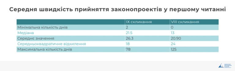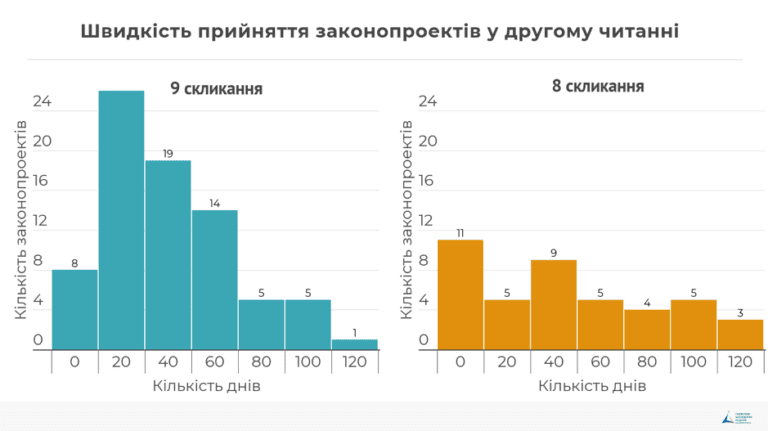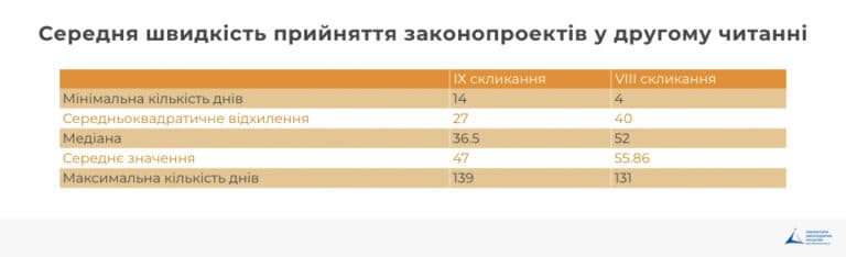 Законопроекти почали прийматися довше у першому читанні і швидше у другому. У середньому, законопроекти, які проходять лише перше читання, ухвалюються в цілому за 26 днів, що більше на 5 днів для аналогічних законопроектів у VIII скликанні. Законопроекти, які проходять два читання, ухвалюються в цілому за 47 днів, що менше на 9 днів для аналогічних законопроектів у VIII скликанні.