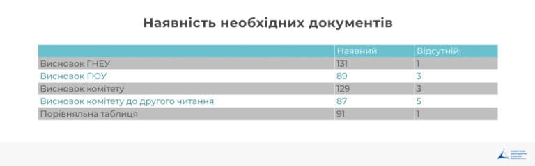 У IX скликанні в цілому задовільні результати щодо наявності необхідних документів. Утім, наприклад, один з законопроектів не мав порівняльної таблиці до другого читання. Це означає, що депутати не бачили текст законопроекту, за який вони голосували.